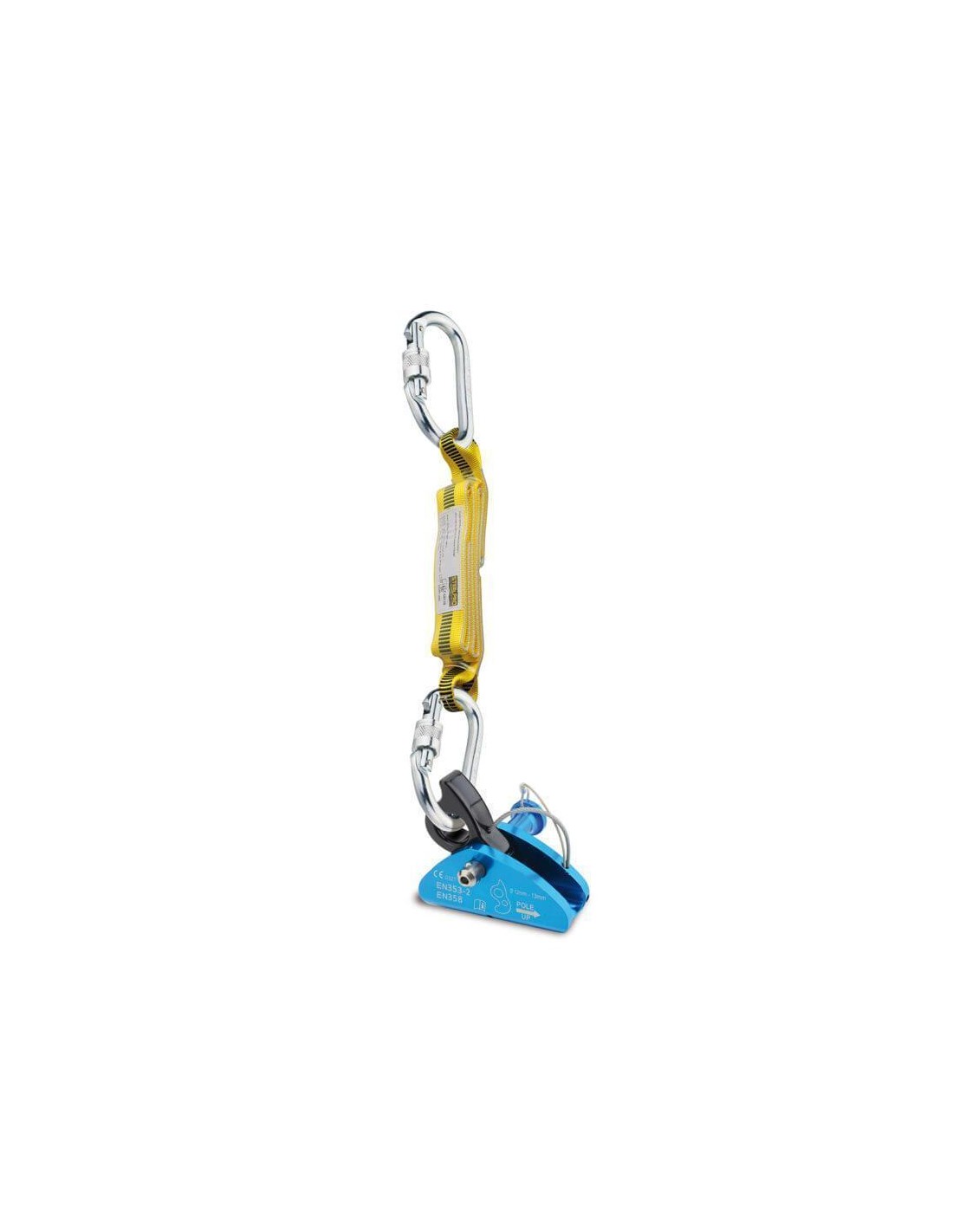 - Usos: Como elemento anticaídas deslizante en líneas de anclaje flexible (cuerdas de línea de vida de 12-13 mm. diámetro) y como componente de amarre de sujeción y posicionamiento impidiendo alcanzar el punto de caída (quitando el absorbedor) o simplemente para posicionarse con un cinturón, dejando las manos libres.